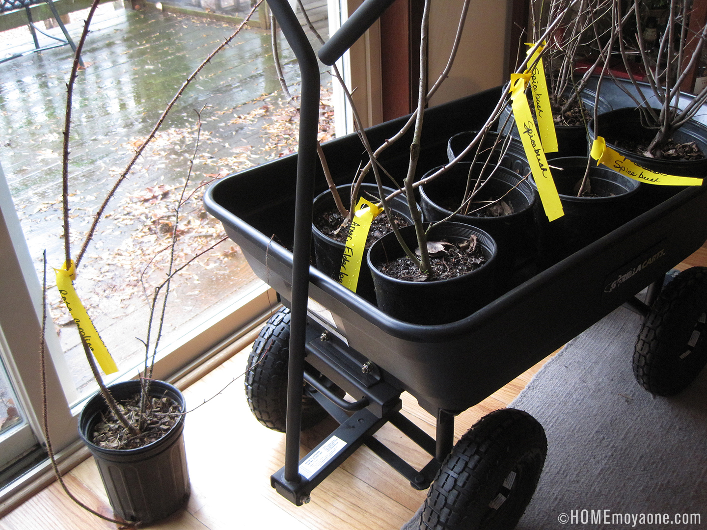 We got a Serviceberry, a Black Chokeberry, an American Elderberry, a Carolina Rose, and three Spice Bushes. There they are, awaiting their future: