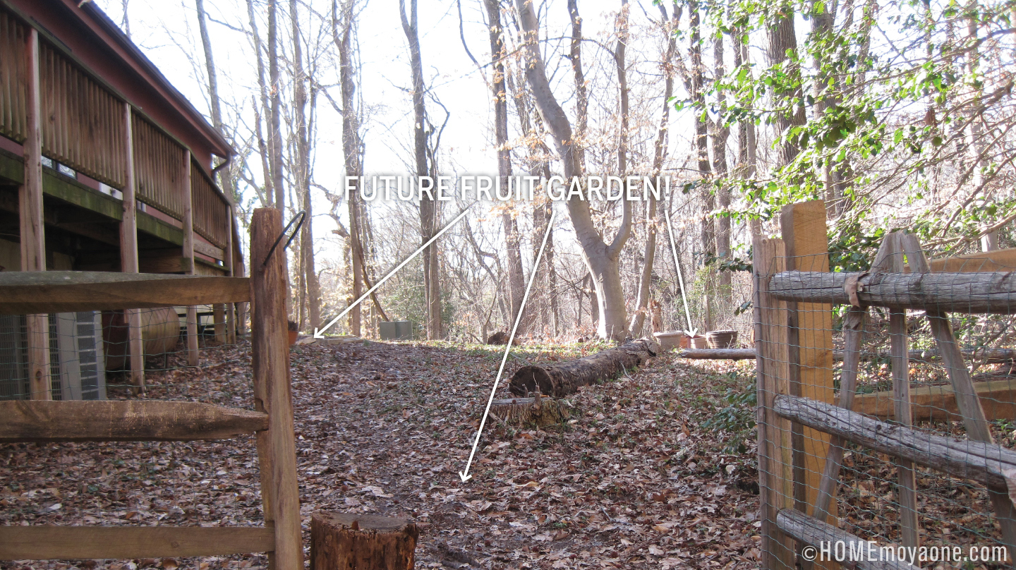 On the north side of the house is currently an enclosed area of sorts, with a collapsing fence. (Previously seen in this breach photo.) We want to create a native edibles garden there (“fruit garden” on the diagram)—properly fenced in against marauding deer of course—and so we bought a bunch of native fruit bushes at the plant sale.