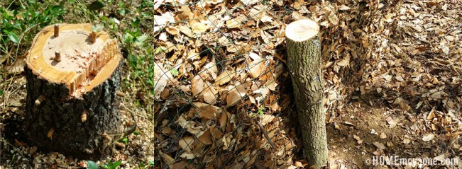 Above, on the left, is a stump with its mushroom plugs inserted, pre hammering and waxing. And on the right, an inoculated log that we set up as a sort of leaf cage fence post, the idea being that the leaves and the mushroom logs will form a symbiotic relationship and speed one another along.